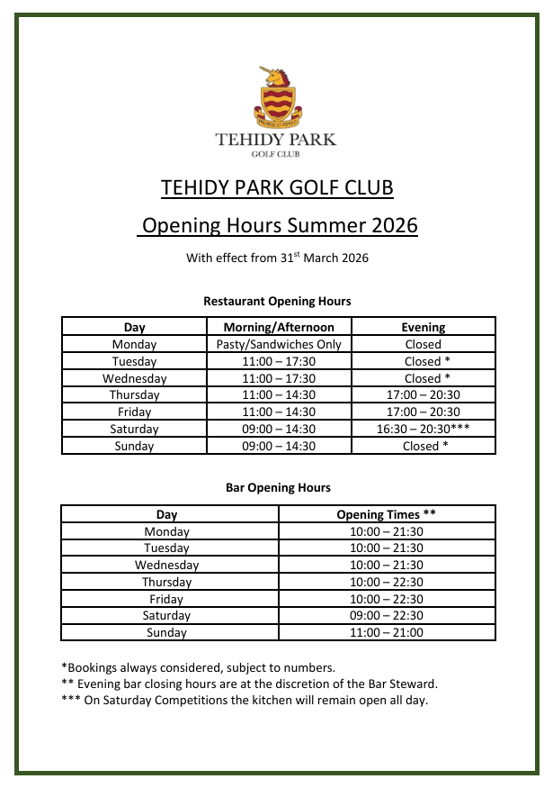 Known affectionately as the 19th hole, the clubhouse is the heart of Tehidy Park. In this welcoming space, members and guests gather to share stories, celebrate victories, and enjoy great food and company. We take great pride in offering excellent service, great value, and high-quality homemade dishes, prepared with care and served with a smile. Our menu features something for every taste, complemented by a wide selection of refreshing beverages.